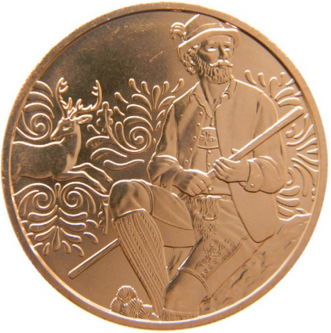 Moneda de 10 Euro de Austria perteneciente a la serie "Trajes tradicionales autríacos" dedicada a los pantalones de cuero. Acuñada en cobre y en calidad S/C.