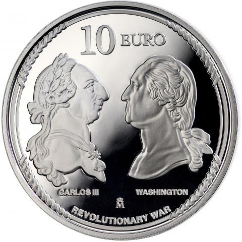 En el reverso de la octava pieza se reproducen los bustos enfrentados del rey de España Carlos III y George Washington. En sus bases, respectivamente, las leyendas CARLOS III y WASHINGTON; más abajo, la marca de Ceca. En la parte superior de la moneda, en sentido horizontal, figura el valor facial de la pieza, 10 EURO. En la parte inferior de la moneda, en forma circular y en mayúsculas, aparece la leyenda REVOLUTIONARY WAR. Rodea los motivos y leyendas una compostura en forma de orla.