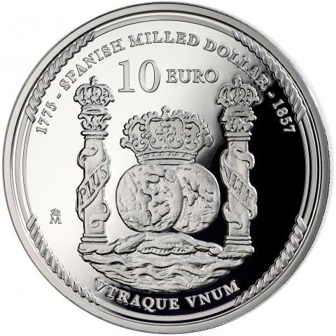 En el reverso de la sexta pieza aparece una representación de los motivos y leyendas de un real de a ocho; a su izquierda, la marca de Ceca; encima, el valor facial de la pieza, 10 EURO. En la parte superior de la moneda, en forma circular y en mayúsculas, figura la leyenda 1775 – SPANISH MILLED DOLLAR – 1857. En la parte inferior, en forma circular y en mayúsculas, aparece la leyenda VTRAQUE VNUM. Rodea los motivos y leyendas una compostura en forma de orla.