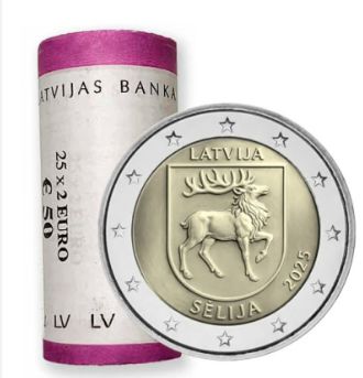 Cartucho de 25 monedas de 2 Euro Letonia 2025 dedicada a la Región Histórica de Sēlija. En calidad S/C.