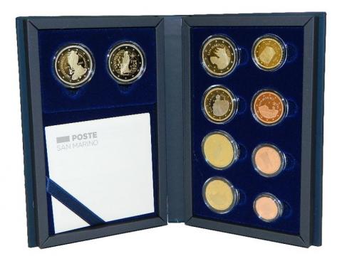 Estuche de lujo numerado de San Marino con las 8 monedas Euro (0.01 - 2 €) + las dos conmemorativas anuales 2 Euro 2025 Miguel Ángel y 2 Euro 2025 Jubileo calidad PROOF.