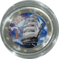 Moneda de 2 Euro Italia 2025 dedicada a la Vuelta al mundo del buque escuela Amerigo Vespucci 2023-2025, coloreada procedente de cartucho en calidad S/C.
