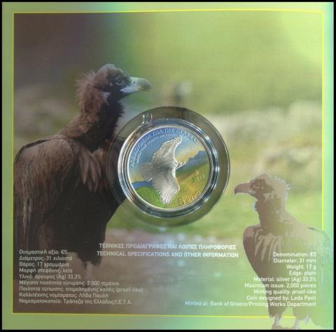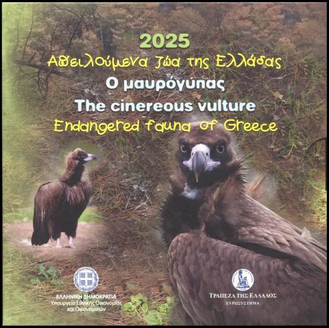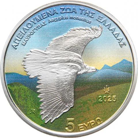 Moneda con un valor facial de 5 euros, dentro de la serie conmemorativa «Medio Ambiente – Fauna en Peligro de Extinción en Grecia». En este año 2025, la pieza esta dedicada al buitre negro (Aegypius monachus), una de las aves rapaces más imponentes y, a la vez, más amenazadas del país. Acuñada en plata, coloreada y en su blister original con un estado de coservación FDC.