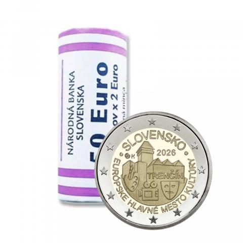 Cartucho oficial con 25 monedas de 2 Euro Eslovaquia 2026 dedicada a Trencín, Capital Europea de la Cultura 2026, en calidad S/C.