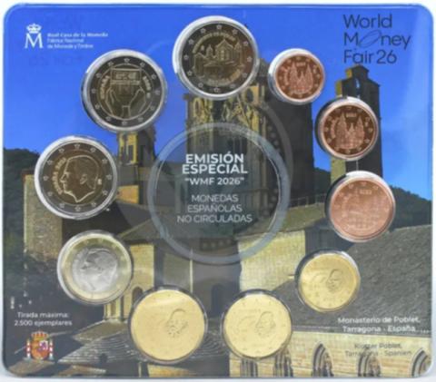Con motivo de la celebración de la World Money Fair 2026, la FNMT-RCM pone a la venta, en edición especial, limitada y dedicada a esta feria, un set con las monedas en euros españolas del año 2026, en un blister numerado que protege las monedas y, al mismo tiempo, permite la perfecta visualización de ambas caras de las mismas.