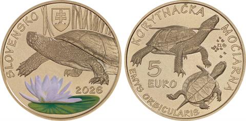 Moneda de 5 Euro de Eslovaquia 2026 de la Serie Fauna y flora en Eslovaquia dedicada a la Tortuga de estanque europea, en calidad S/C.