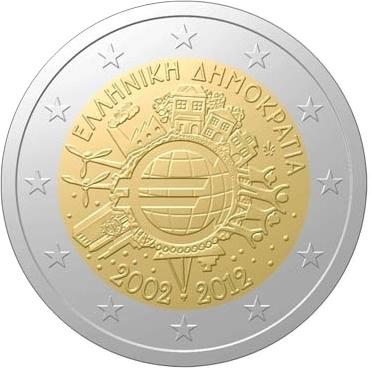 Moneda de 2 Euro Grecia conmemorativa de los 10 Años de la circulación de monedas y billetes Euro 2012 sacada de cartucho en calidad SC.