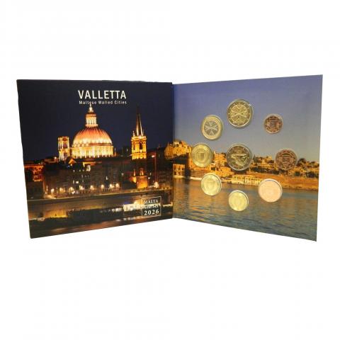 Cartera oficial de Malta con las 8 monedas Euro (0.01 - 2 €) del 2026 + 2 Euro Malta 2026 Valletta, en calidad BU.