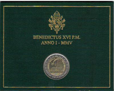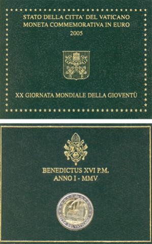 Cartera Oficial de la Ciudad del Vaticano con los 2 Euros Conmemorativos del Vigésimo Día Mundial de la Juventud 2005.