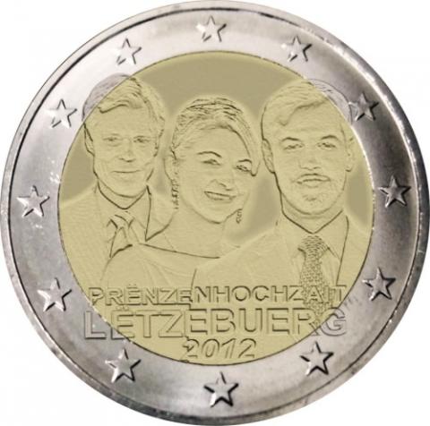 Moneda de 2 Euro Luxemburgo 2012 conmemorativa del Enlace entre el Príncipe Guillermo y la Condesa Estefanía de Lannoy. Es la primera moneda resultado de la nueva normativa que permite acuñar dos conmemorativas por año (Una tercera si existe una común para toda la Eurozona). Debido a la aplicación tardía de la normativa fue imposible emitirla en el 2012 y fue puesta en circulación de forma oficial el 21/01/2012.