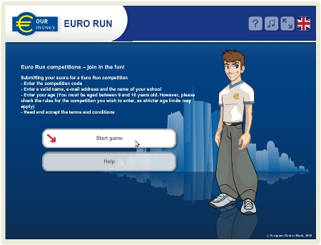 A partir de 1 enero a 31 marzo 2012, el Banco Central Europeo organiza un concurso de euros en línea de ejecución para los niños de edades comprendidas entre 9 y 12 y que residen en la Unión Europea (con exclusión de las regiones ultraperiféricas y los países y territorios de ultramar). Para competir, los jugadores están obligados a aceptar los siguientes términos y condiciones, introduzca el código de la competencia y registrar su nombre completo, edad y dirección de correo electrónico.