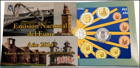 Cartera oficial de España con los 8 valores Euro del 2014 + Medalla Conmemorativa dedicada a la Comunidad Autónoma de Galicia.