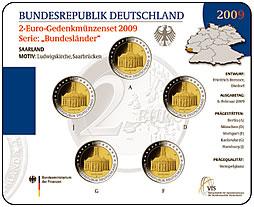 Set Oficial con la serie de 5 monedas, una por Ceca A, D, F, G, y J, 2009 conmemorativas del Estado federal de Sarre, en calidad BU.