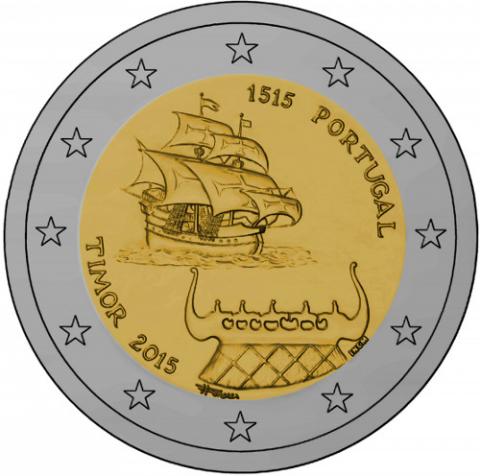 Moneda de Portugal de 2 Euro conmemorativos de los 500 Años de los primeros contactos con Timor, procedente de cartucho en calidad S/C.