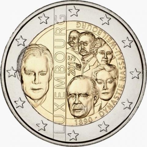 Moneda conmemorativa de 2 Euro Luxemburgo 2015 dedicada al 125 aniversario de la dinastía Nassau-Weilburg.