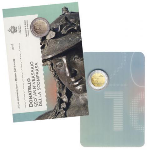 Cartera oficial de San Marino con los 2 Euro conmemorativos 2016 dedicados al 550 Aniversario de la Muerte de Donatello.