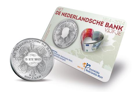 Coincard oficial de Holanda con los 5 Euro 2014 dedicados al Nederlandsche bank, en calidad BU.