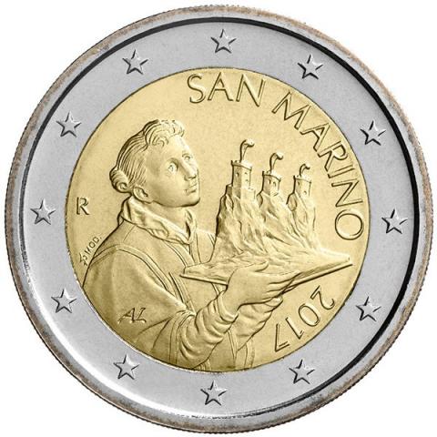 Moneda de 2 Euro San Marino 2017 con el nuevo diseño que presenta una parte de una pintura de Urbinelli, procedente de cartucho en calidad S/C.