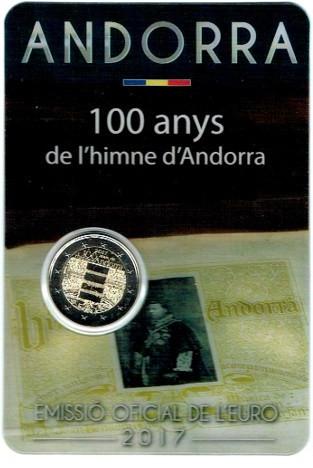 Blister de Andorra con los 2 Euro 2017 conmemorativos de los 100 Años del Himno de Andorra en calidad BU.