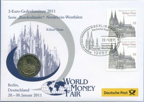 Cartera con los 2 Euro Alemania 2011 conmemorativas Renania del Norte-Westfalia en el Bundesrat, mostrando la Catedral de Colonia, acuñada en Stuttgart F y emitida para el World Money fair con Sello y matasello de dicha fecha.