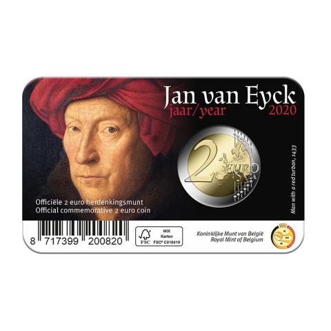 Coincard oficial de Bélgica con los 2 Euro 2020 dedicada al Pintor Jan van Eyck en calidad BU, empaquetada con el cara frontal en Francés.
