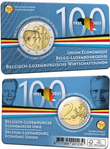 Coincard oficial de Bélgica con los 2 Euro 2021 dedicada al Centenario de la constitución de la Unión Económica Belga-Luxemburguesa (BLEU), en calidad BU.