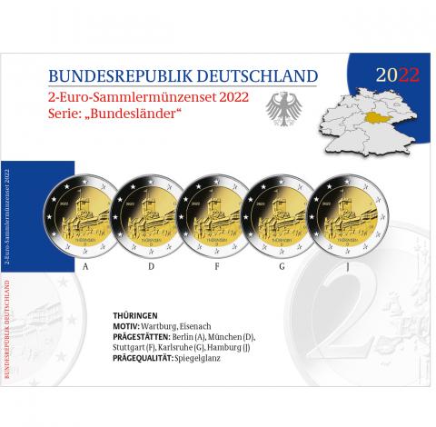Cartera oficial de Alemania con las 5 cecas (A, D, F, G, J) de 2 Euro Alemania 2022 conmemorativa del Estado Thüringen con motivo "Castillo de Wartburg", en calidad PROOF.