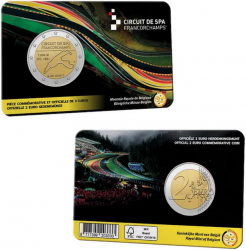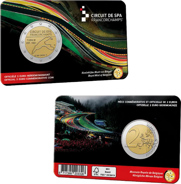 Coincard con los 2 Euros de Bélgica 2025 dedicados al Circuito de Spa-Francorchamps, en calidad BU. Versión francesa.