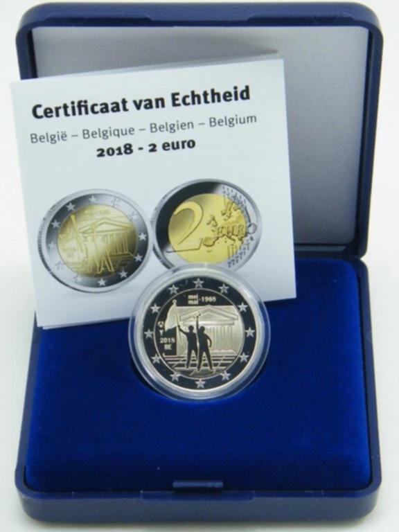 Estuche oficial de Bélgica con los 2 Euro conmemorativos de los 50 años de la revueltas estudiantiles de Mayo del 1968. En calidad PROOF.